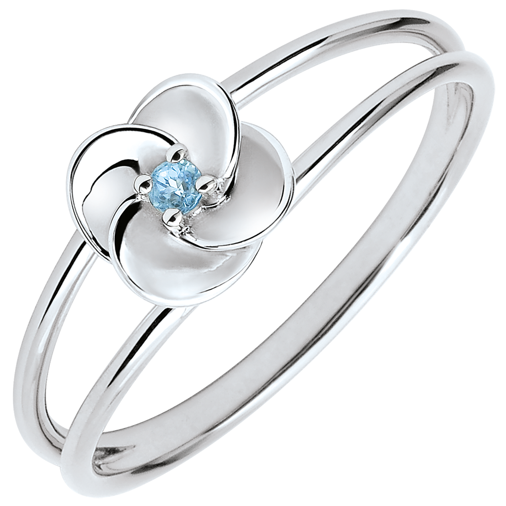 I petali di questa piccola rosa in oro bianco si schiudono su un cuore eterno di topazio.