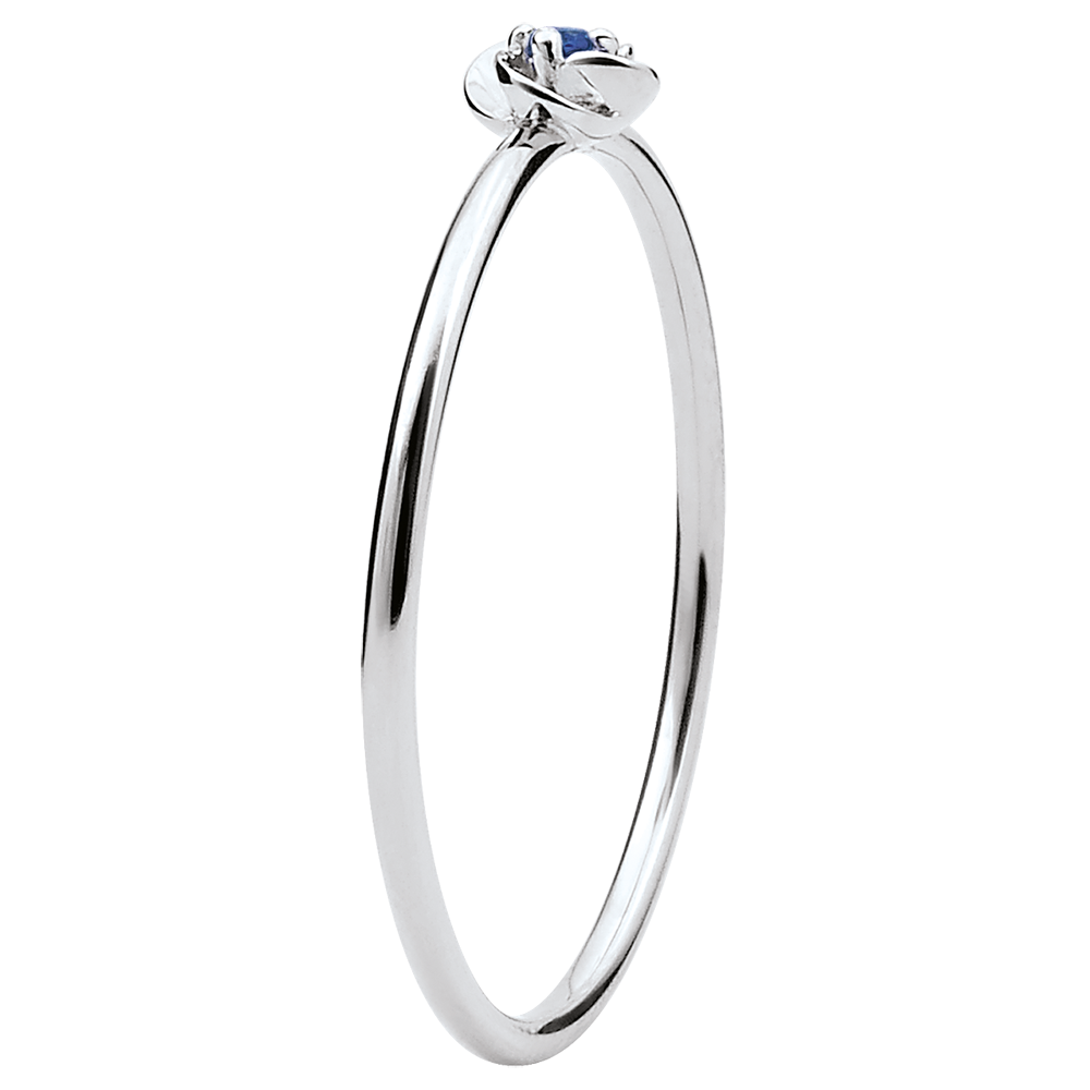 I petali di questa piccola rosa in oro bianco si schiudono su un cuore eterno di zaffiro.