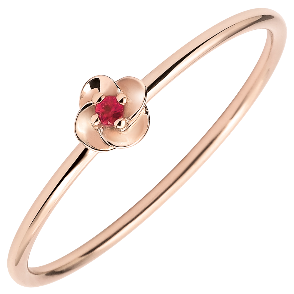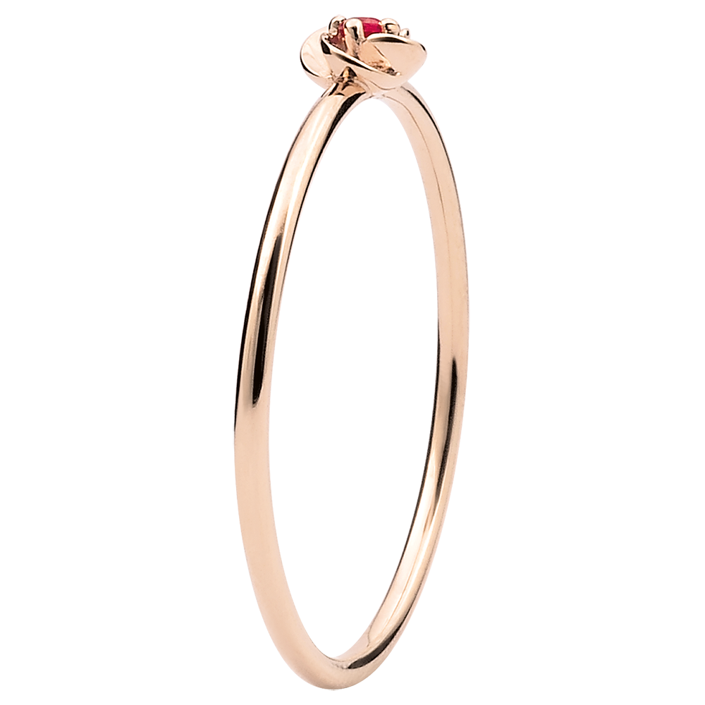 I petali di questa piccola rosa in oro rosa si schiudono su un cuore eterno di rubino.