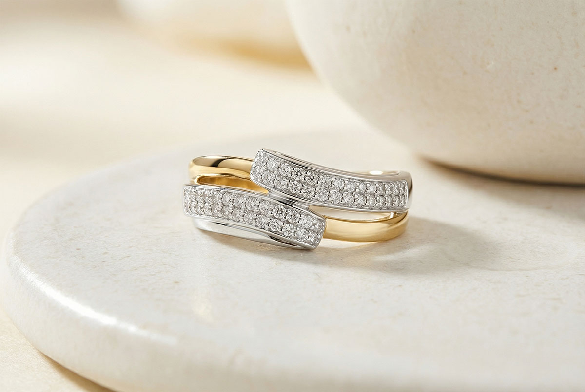 Un anello dal design delicatamente ondulato e traforato, esaltato da un pavé luminoso e leggero.