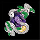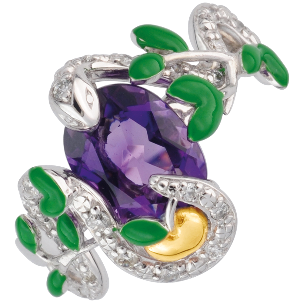 Un serpente d'argento e diamanti si nasconde tra le foglie per proteggere la mela, frutto della tentazione. Ametista viola, mela in argento placcato Oro giallo e foglie ricoperte di lacca verde.