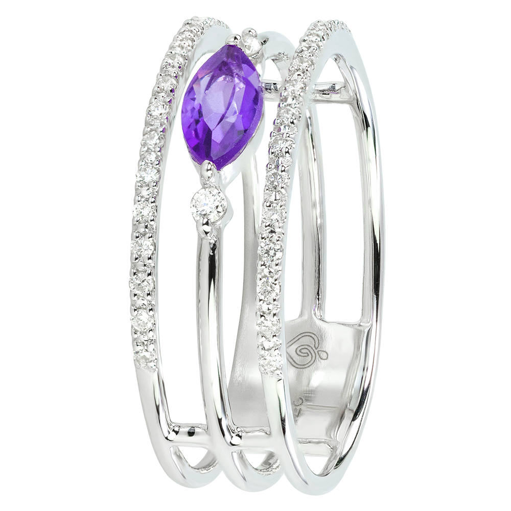 Come due preziose palpebre, le linee d'oro e diamanti proteggono la preziosa pupilla simboleggiata da una navetta di ametista. Un anello sofisticato da portare tutti i giorni o in occasioni speciali