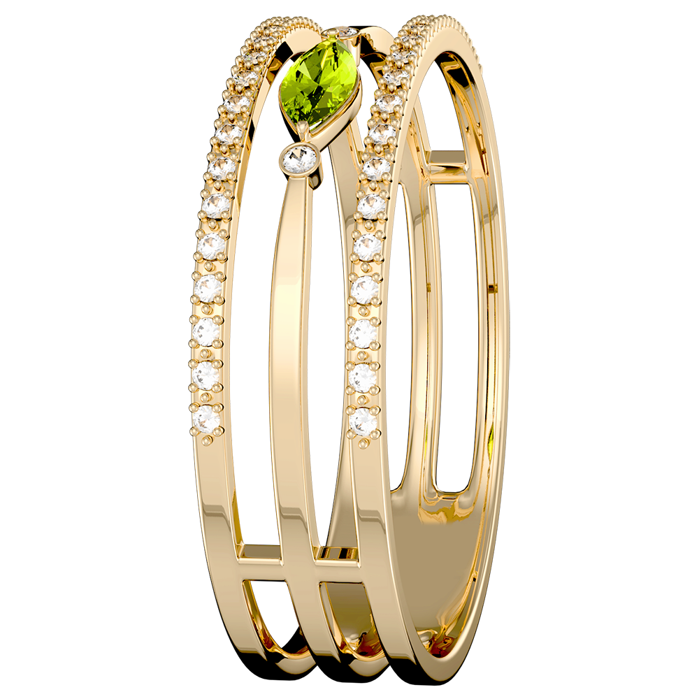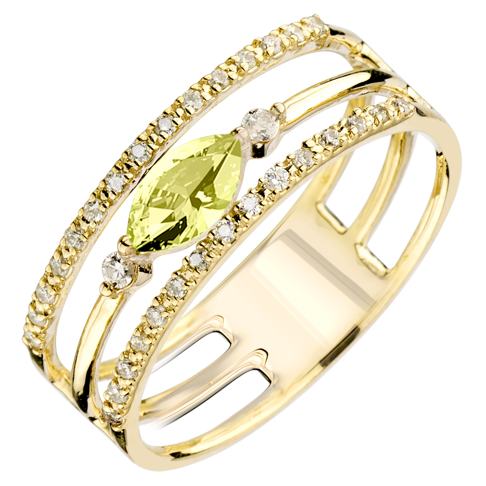 Come due preziose palpebre. le linee d'oro e di diamanti proteggono la preziosa pupilla simboleggiata da una navetta di peridoto. Un anello sofisticato da portare tutti i giorni o come anello d'eccezione