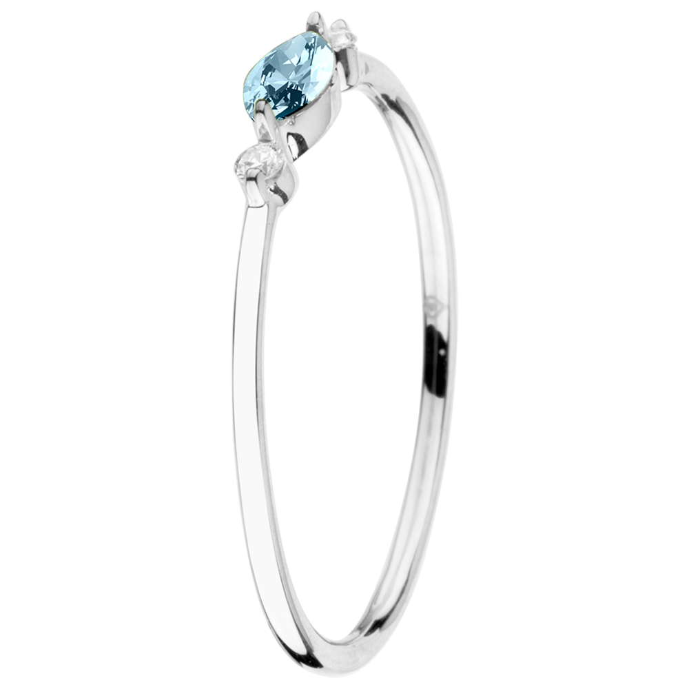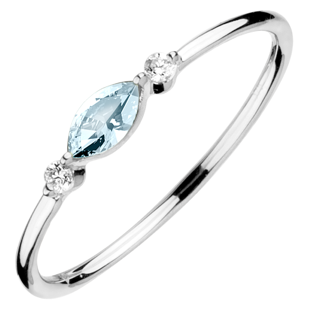 La preziosa pupilla simboleggiata da una navetta di topazio blu troneggia al centro di questa sottile montatura in filo d'oro bianco. È circondata da due sublimi diamanti come due lacrime cristallizzate per sempre.