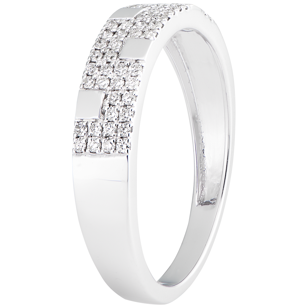 Un originale anello grafico con una doppia fila di diamanti punteggiati di quadrati in oro bianco. Un modello unisex da indossare soli o in coppia.