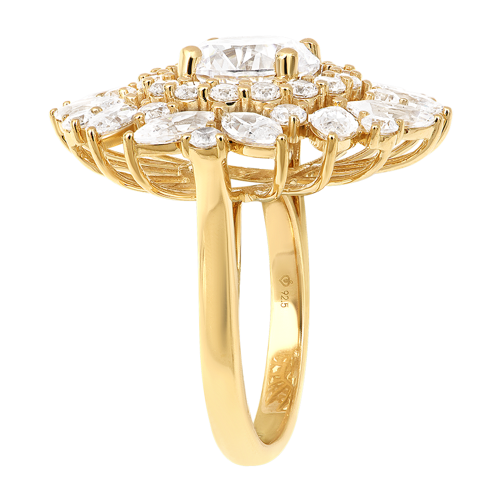 Un gioiello solare e regale: l’anello Solarys in oro giallo riciclato splende attorno a un diamante sintetico da 3 carati, incastonato al centro di una corolla luminosa.