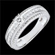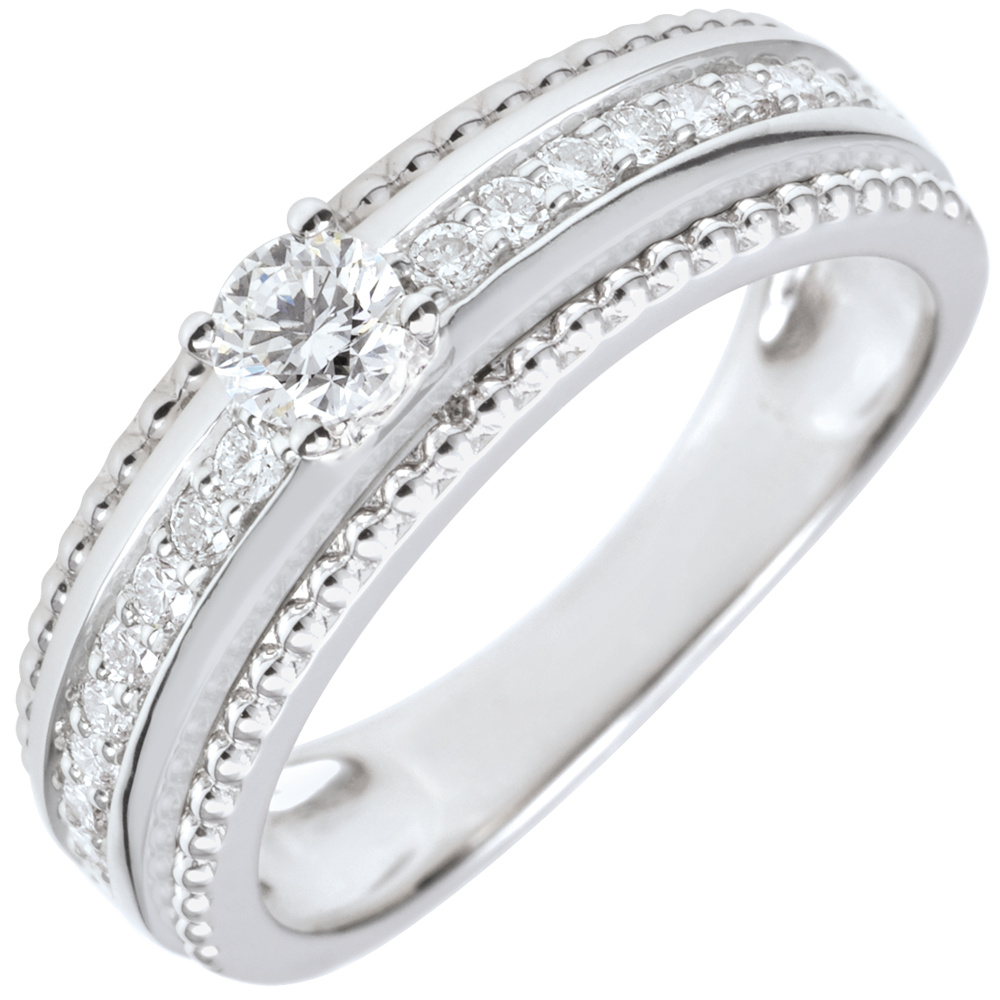 Un diamante solitario è sublimato da due fila di perle d'Oro bianco che incorniciano un anello di diamanti. Un anello dalla femminilità luminosa ed elegante.