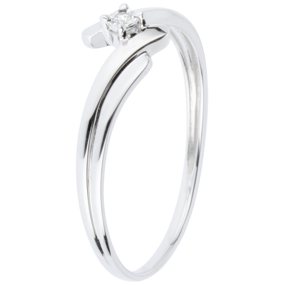Un diamante stretto in una graziosa montatura d'Oro bianco ad ali di cigno.