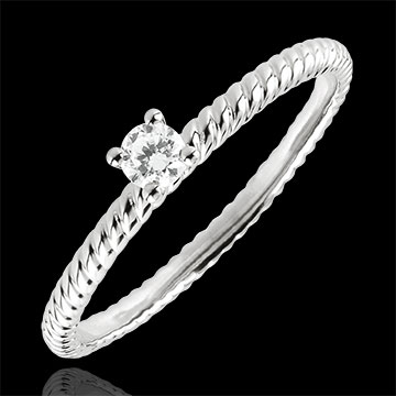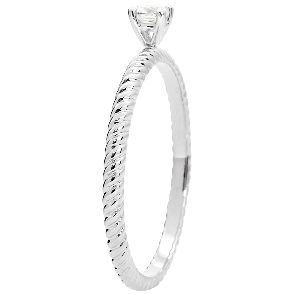 Un diamante solitario su 4 griffe poggia su una delicata cordicella in Oro. Un anello di fidanzamento originale e senza tempo.