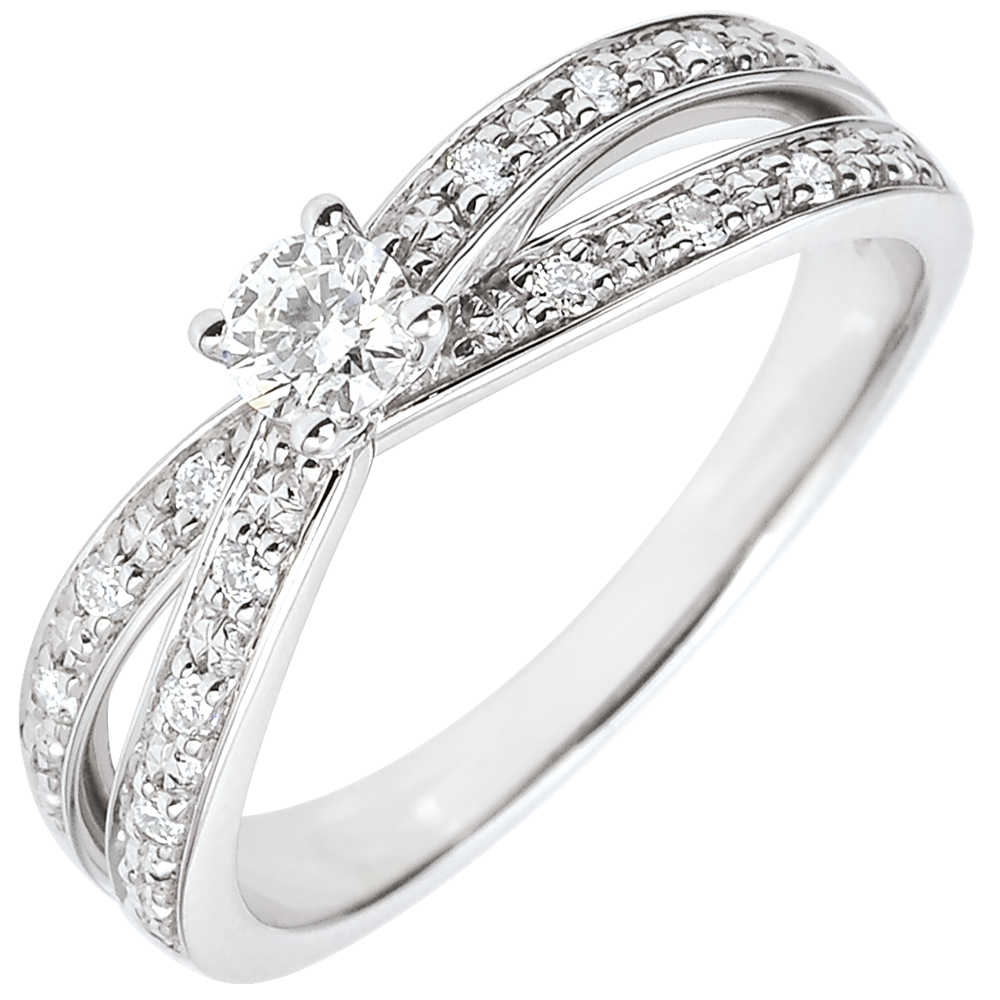 Un duetto d'Oro sinuoso impreziosito da diamanti esalta un sublime solitario.