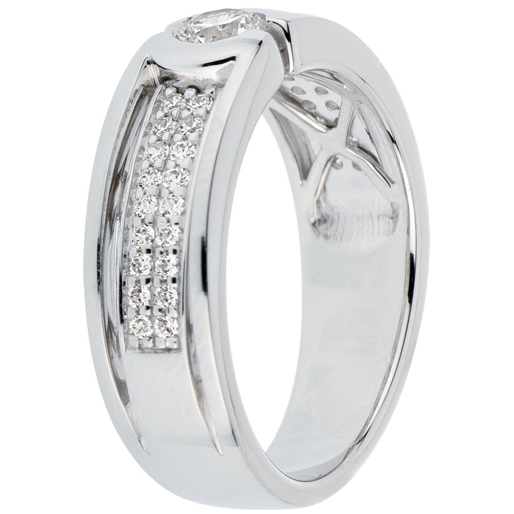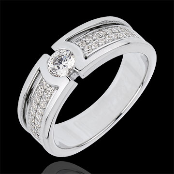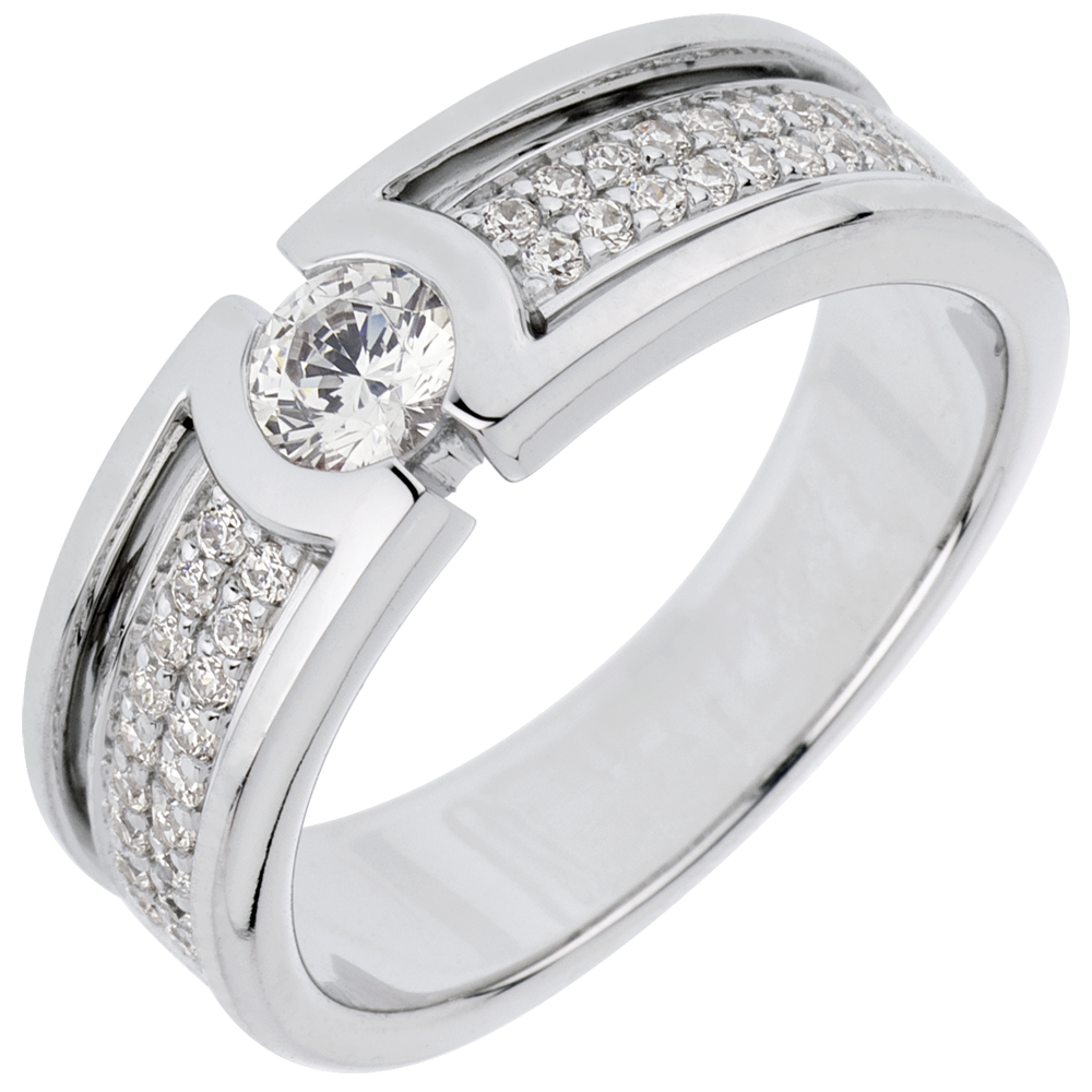 Un diamante solitario è esaltato da una sublime montatura con pavé di diamanti taglio brillante.