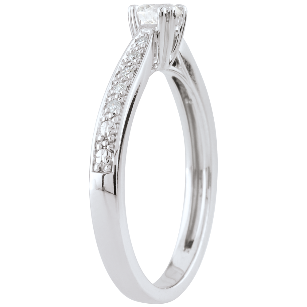 Un diamante solitario è accompagnato da una raffinata costellazione di 8 diamanti.