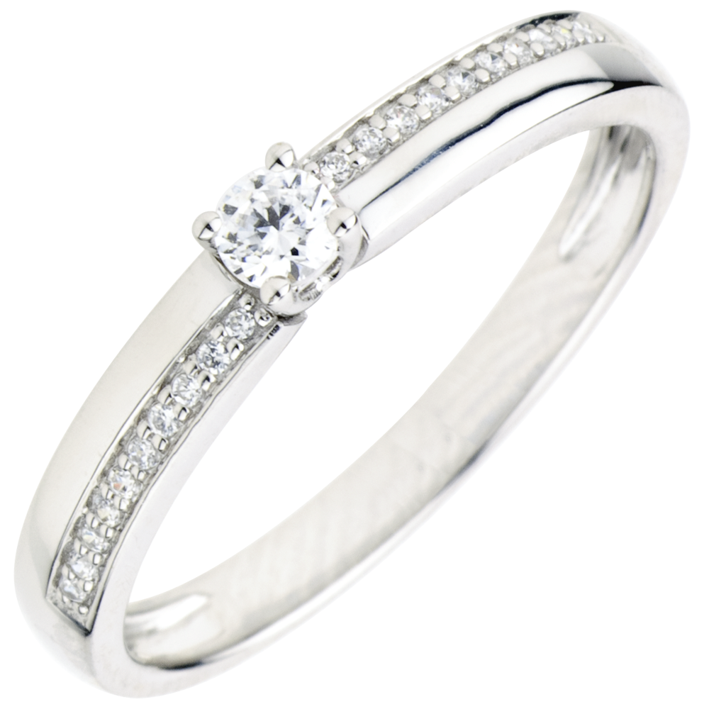 Un diamante solitario troneggia su una montatura asimmetrica con pavé di diamanti per un'eleganza dalla sottile originalità.