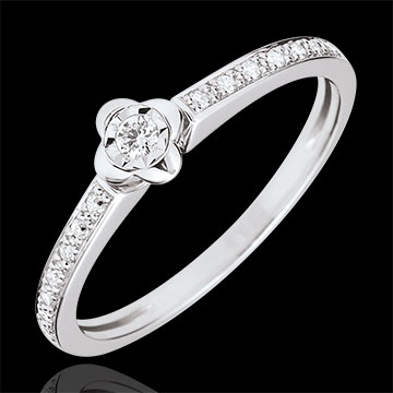 Un fiore delicato reso prezioso da un diamante solitario su un anello di diamanti. Un anello di fidanzamento romantico e moderno.
