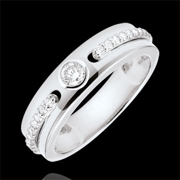 Due linee di diamanti su un anello in Oro bianco si uniscono a un solitario come una promessa di eternità.