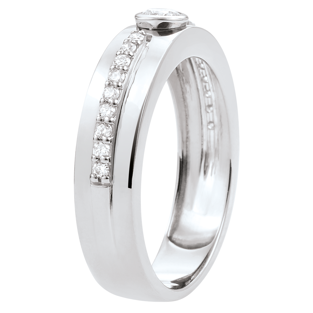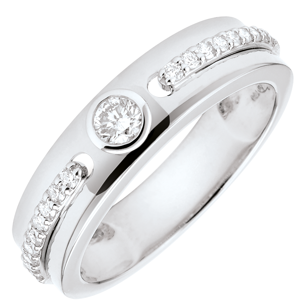 Due linee di diamanti su un anello in Oro bianco si uniscono a un solitario come una promessa di eternità.