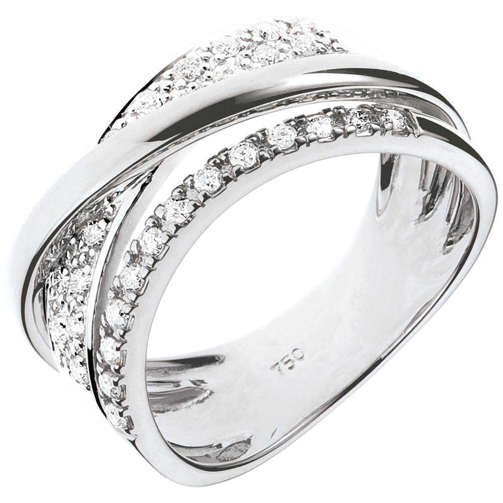 Due anelli in Oro bianco con pavé di diamanti si uniscono a un anello in Oro per un prezioso viaggio su Saturno.