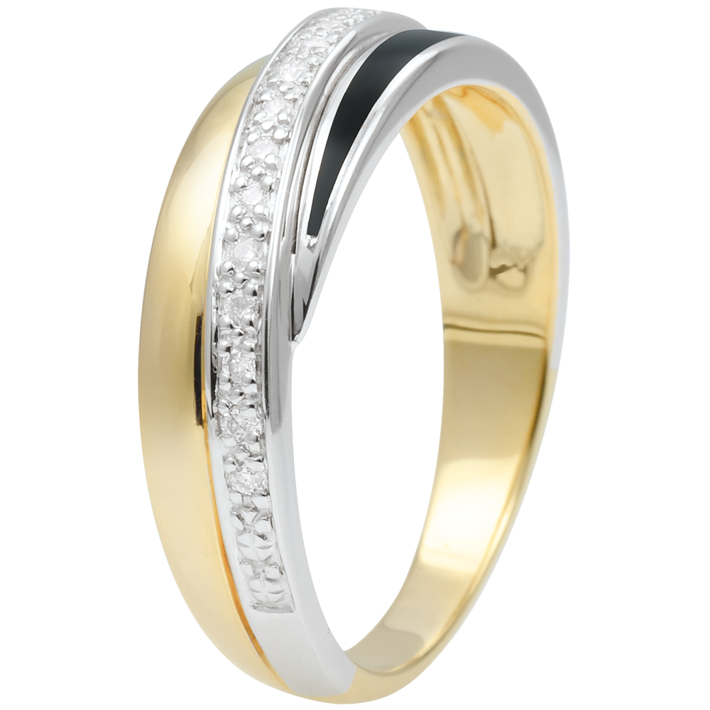 Un trio di lacca nera, diamanti e Oro giallo per un anello moderno e dal fascino senza tempo.