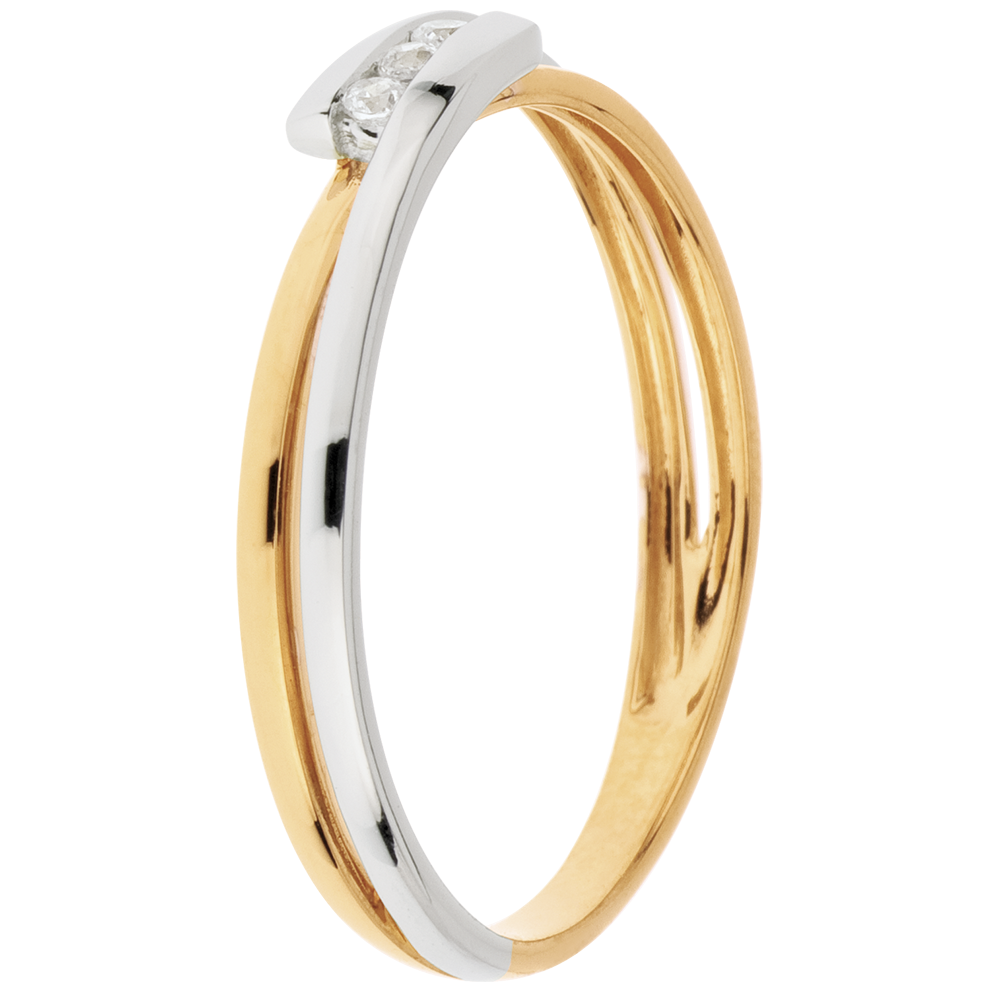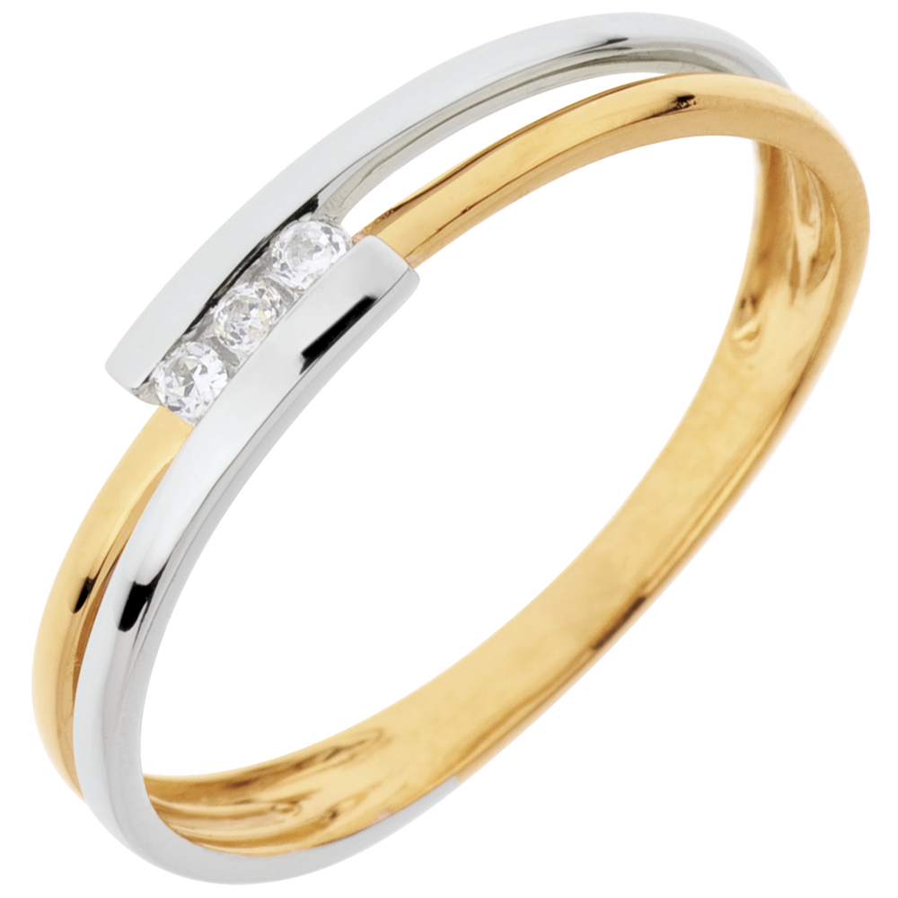 Una trilogia di diamanti su un anello in Oro giallo, abbracciata da un movimento d'Oro bianco.