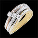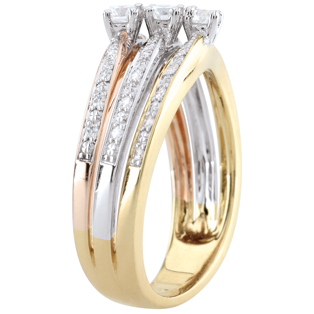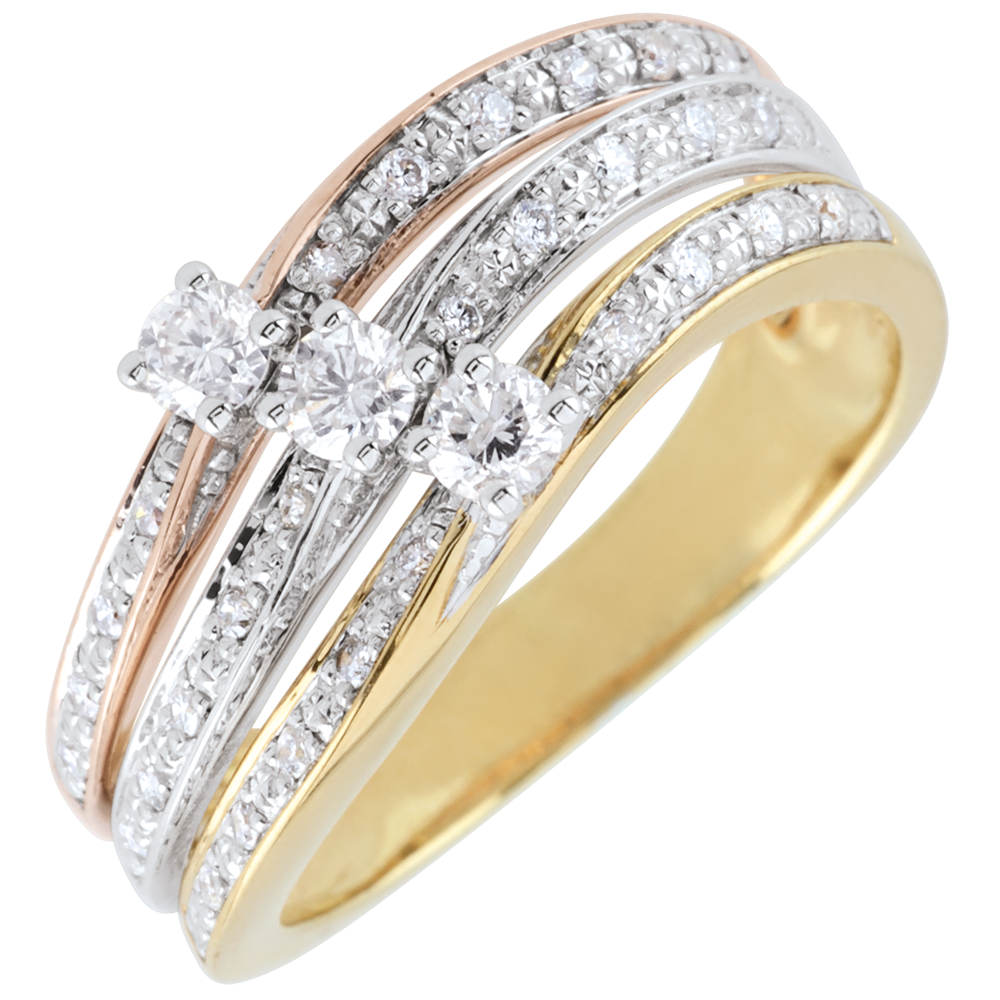 L'unione di tre ori impreziosita da una trilogia di diamanti dà vita a un anello unico e splendente.