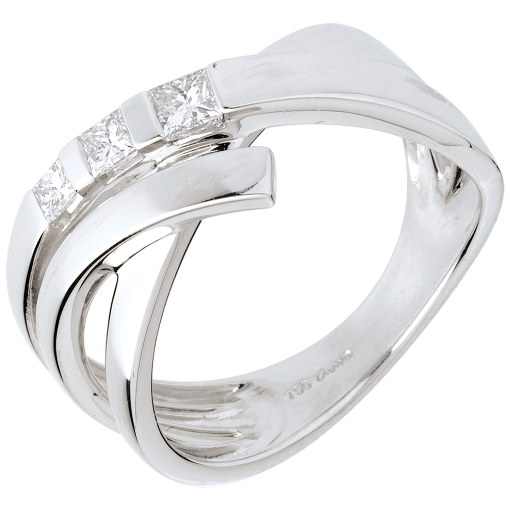 Un anello a treccia per un gioiello leggero e sinuoso, bordato di una trilogia di diamanti a incastonatura chiusa. Una montatura elegante e contemporanea.