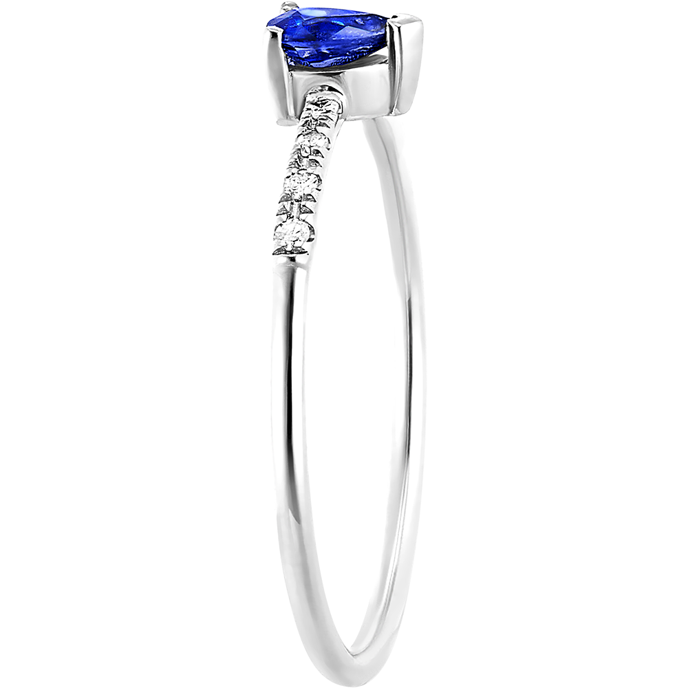 Presenta uno zaffiro blu taglio a goccia da 0,2 carati, circondato da otto diamanti di qualità HSI per un peso totale di 0,048 carati.