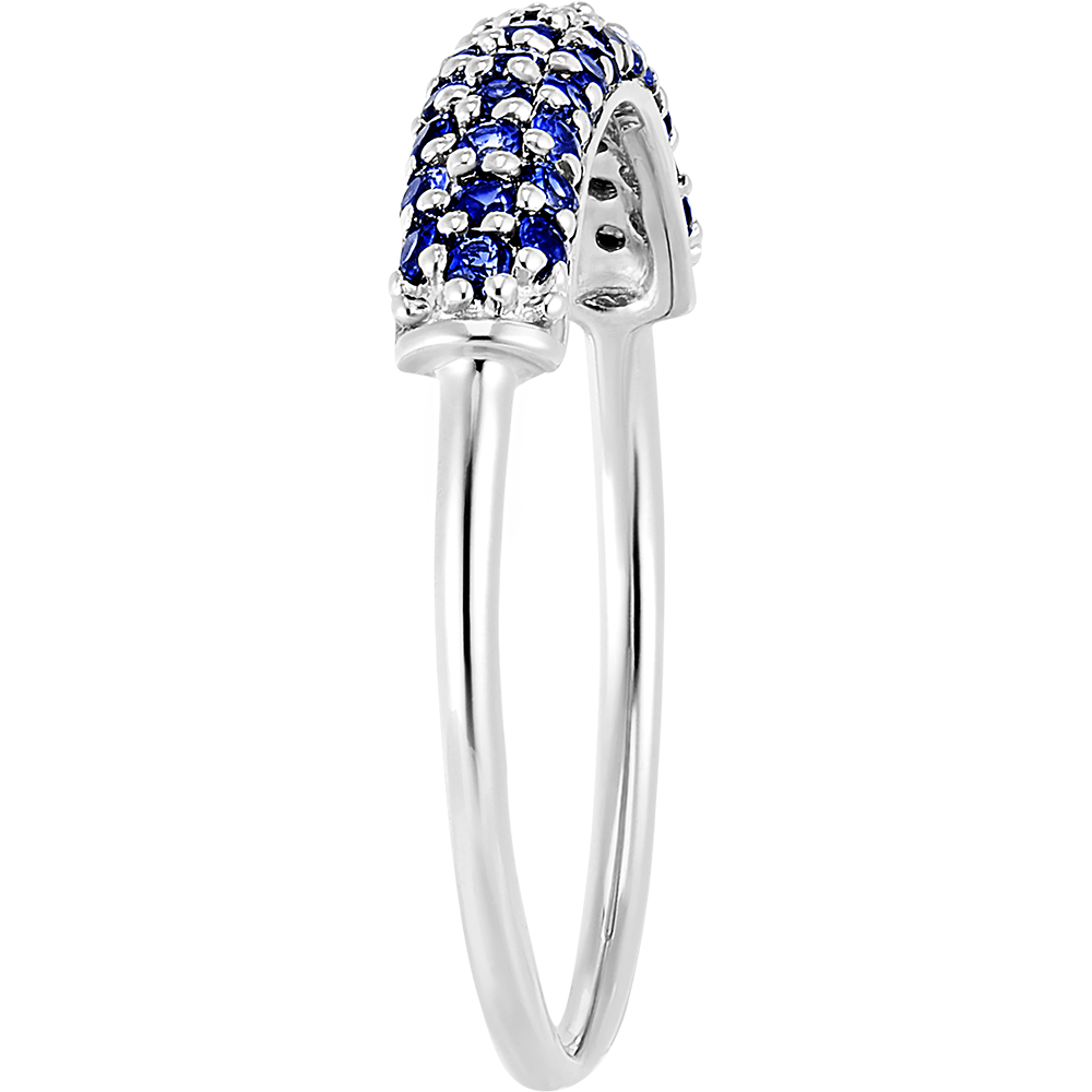 Un anello in oro bianco impreziosito da 40 zaffiri delicati disposti su tre file. Un gioiello classico e senza tempo, con un tocco di colore.