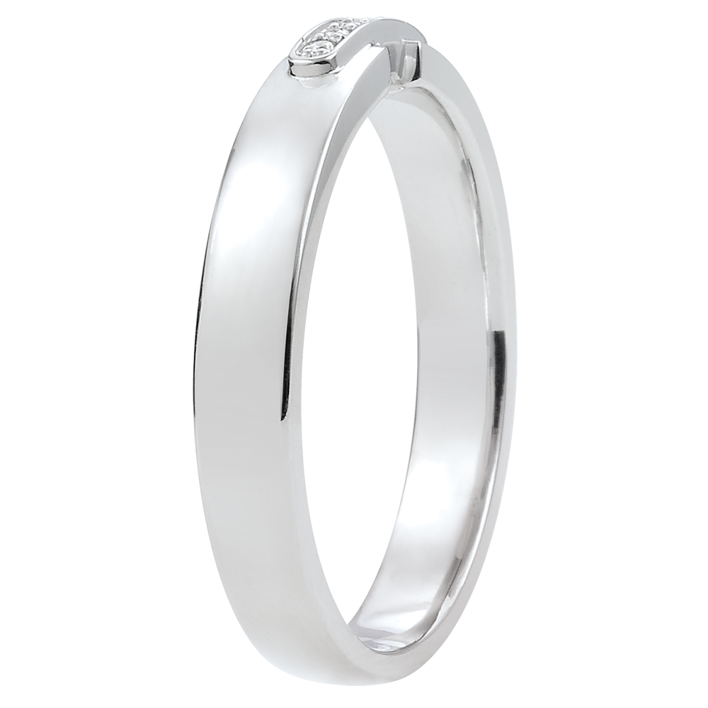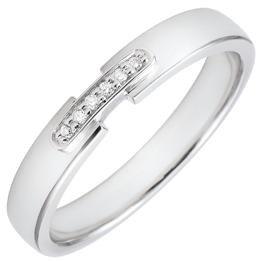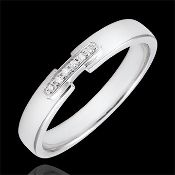 Un delicato anello in Oro bianco unito al centro da un dettaglio in Oro bianco incastonato di diamanti.br>6 Diamanti: 0.024 carati - Oro bianco (18 carati= 750/-): 3.57 g.