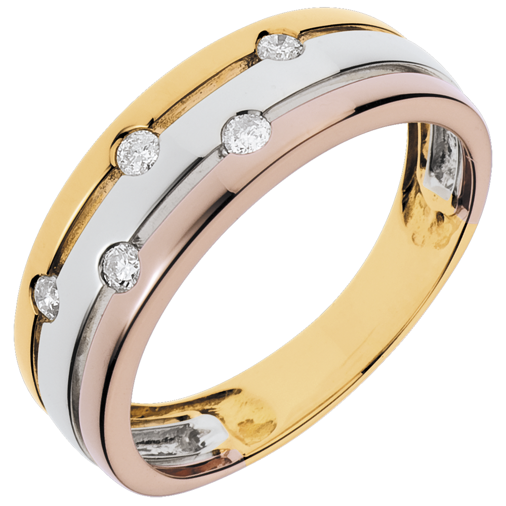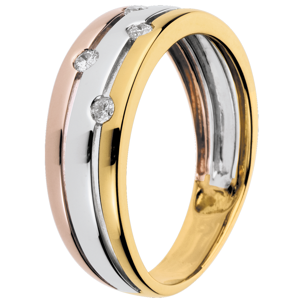Un raffinato anello a tre ori costellati di diamanti, come piccoli pianeti scintillanti.