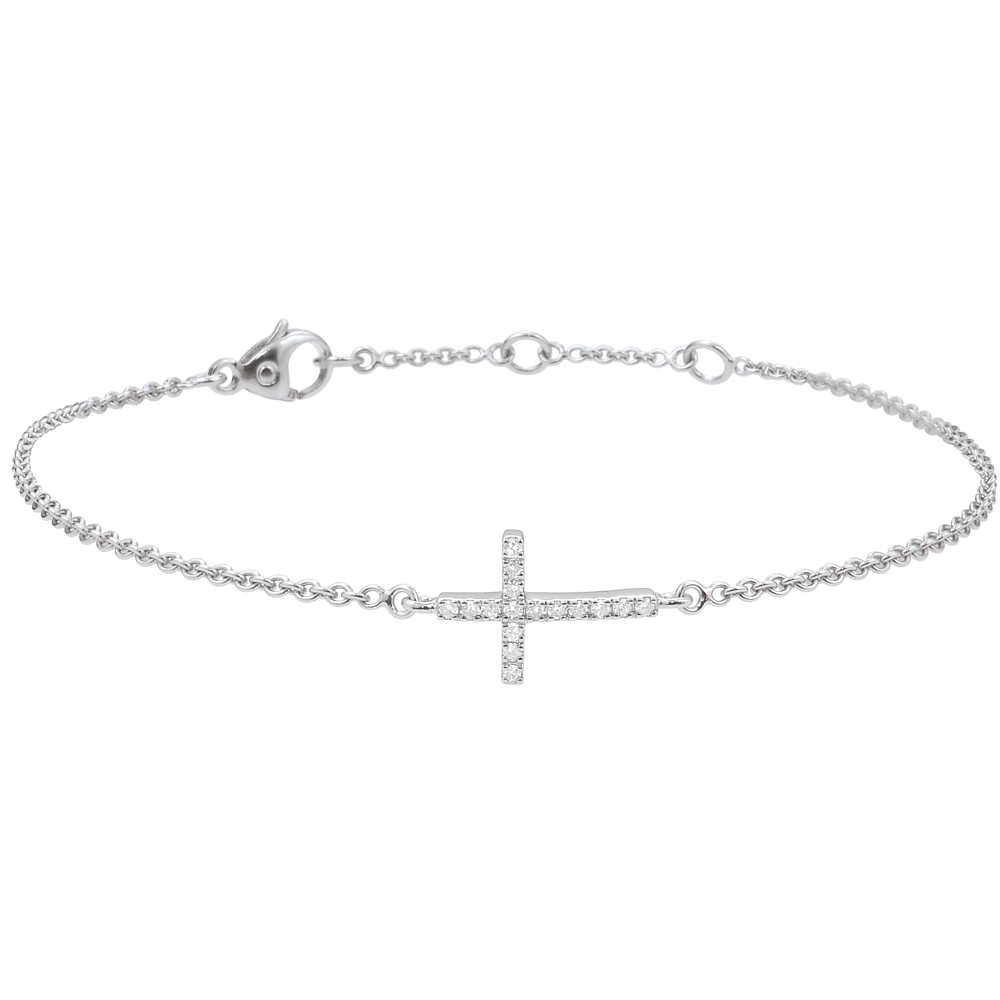 Un bracciale in Oro bianco con un motivo a croce dalle proporzioni fini e delicate, sublimato da un pavé di diamanti e montato su una sottile catenina. Lunghezza modello: 11,5 mm, Altezza modello: 8mm. Disponiblie nelle misure 18 cm, 17cm e 16cm.