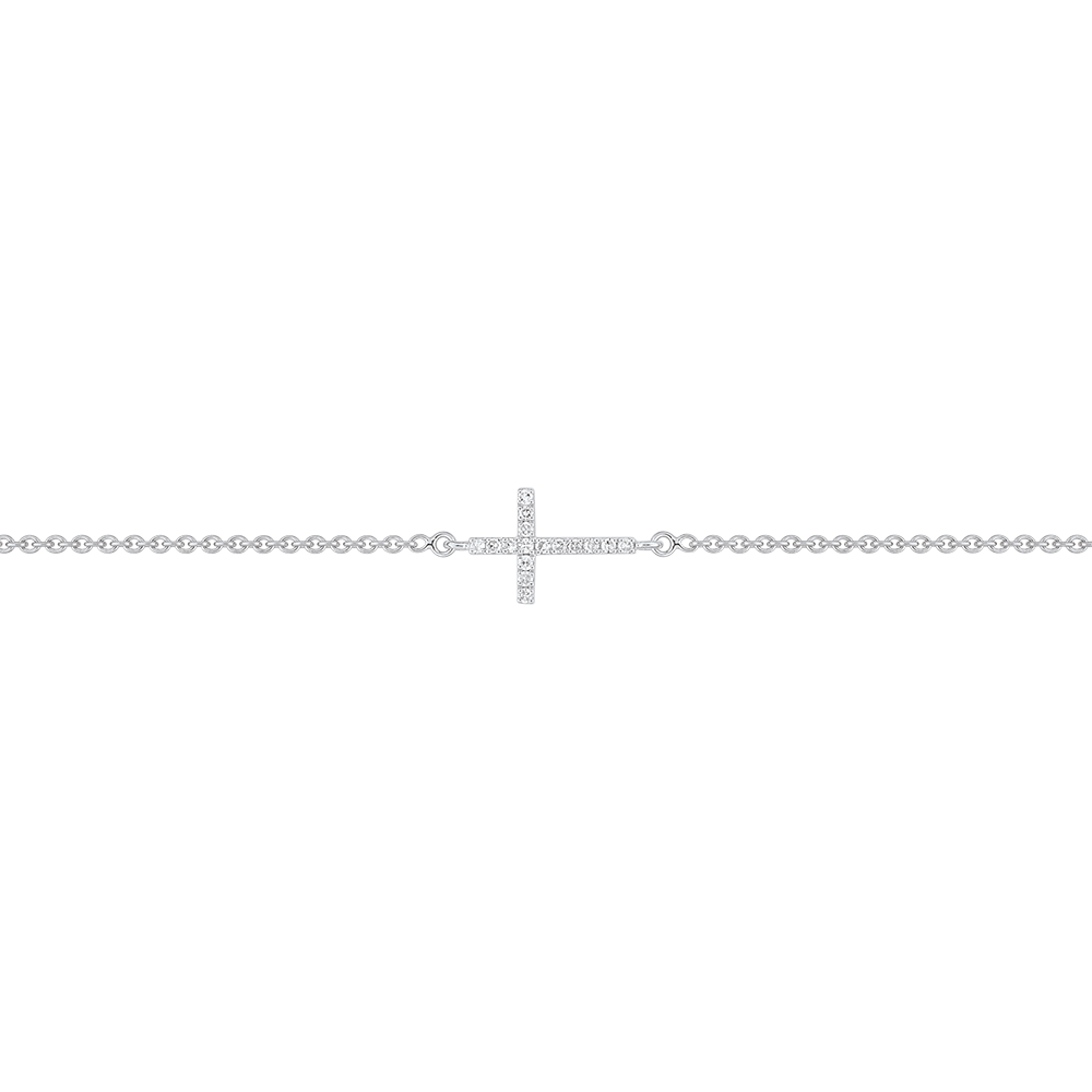 Un bracciale in Oro bianco con un motivo a croce dalle proporzioni fini e delicate, sublimato da un pavé di diamanti e montato su una sottile catenina. Lunghezza modello: 11,5 mm, Altezza modello: 8mm. Disponibile nelle misure 18 cm, 17cm e 16cm.