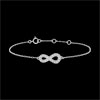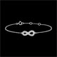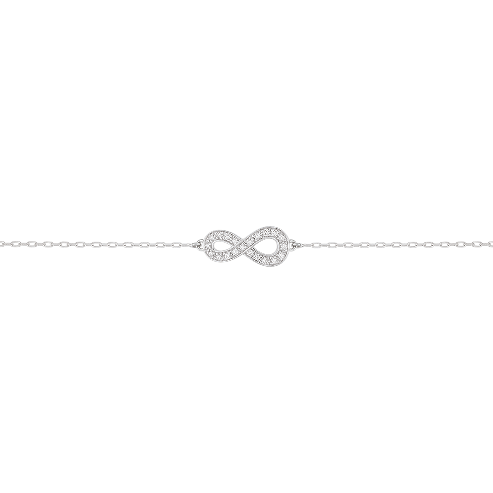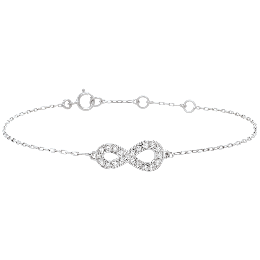 Il segno dell'infinito, in Oro bianco incastonato di diamanti, è montato su un bracciale. Un gioiello simbolo dell'eternità assoluta. Bracciale di lunghezza regolabile: 18cm, 17cm, 16cm. Applicazione di 15mm di lunghezza e di 7mm di altezza.