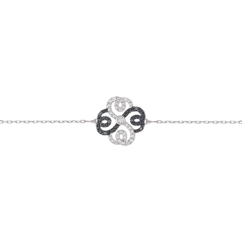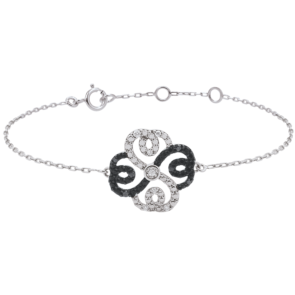 Un sublime braccialetto in Oro bianco incastonato di diamanti bianchi e neri, montato su una catenina. Il gioiello è disponibile in 18 cm, 17cm e 16cm. Applicazione di 14.5 mm di lunghezza e 14.5 mm di altezza.