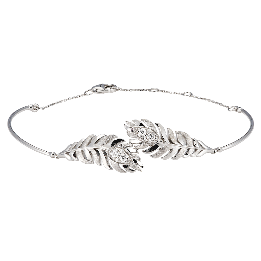 Il bracciale Signature in oro bianco 18 carati presenta un elegante motivo a forma di piuma, ornato con 8 diamanti sintetici. Finemente elaborato, il suo design incastonato si completa con una chiusura discreta. Un pezzo che cattura l'essenza eterea e raffinata delle piume, firma della collezione Panache.