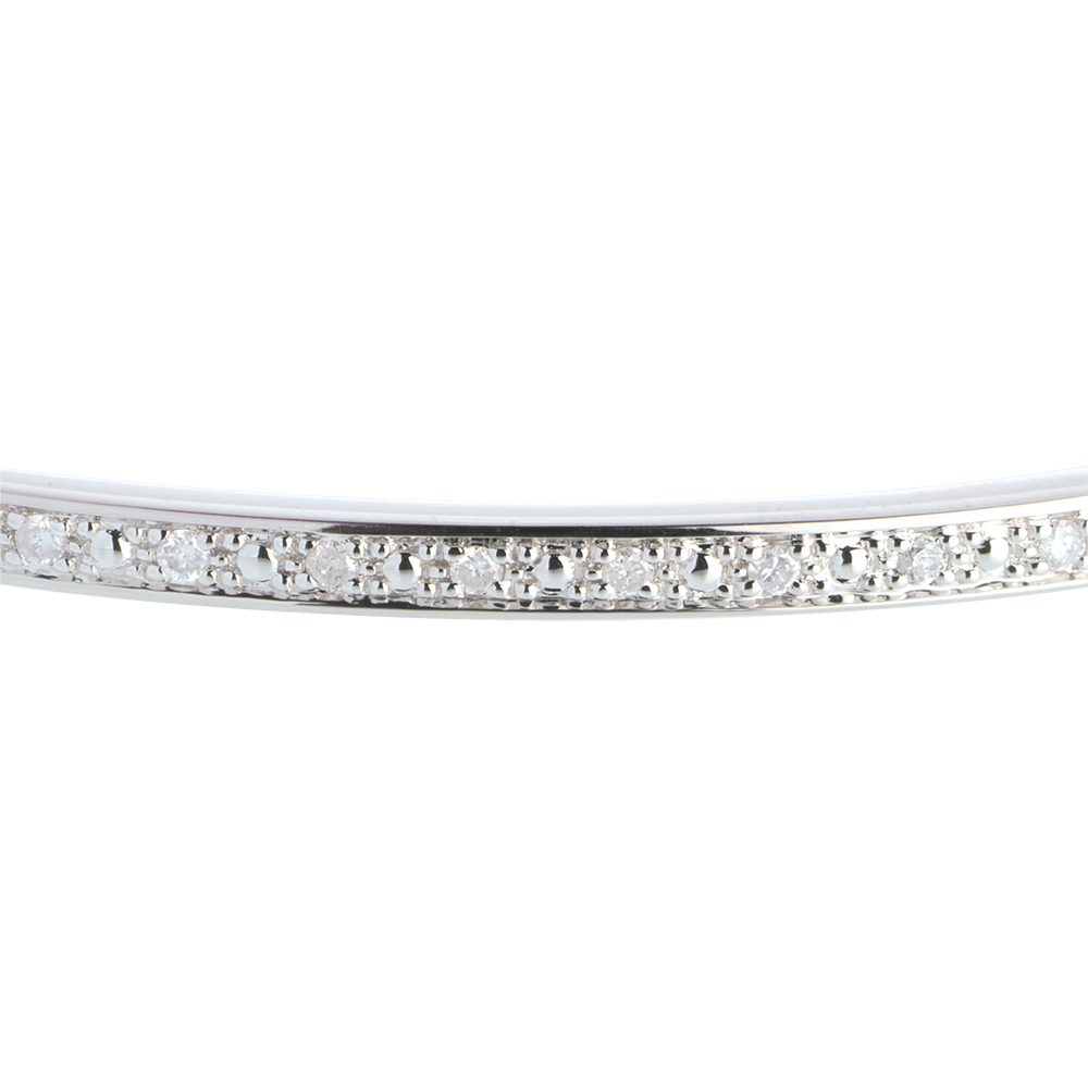Lo splendore iridescente di un raffinato pavé di diamanti su un bracciale rigido dal design essenziale e delicato.