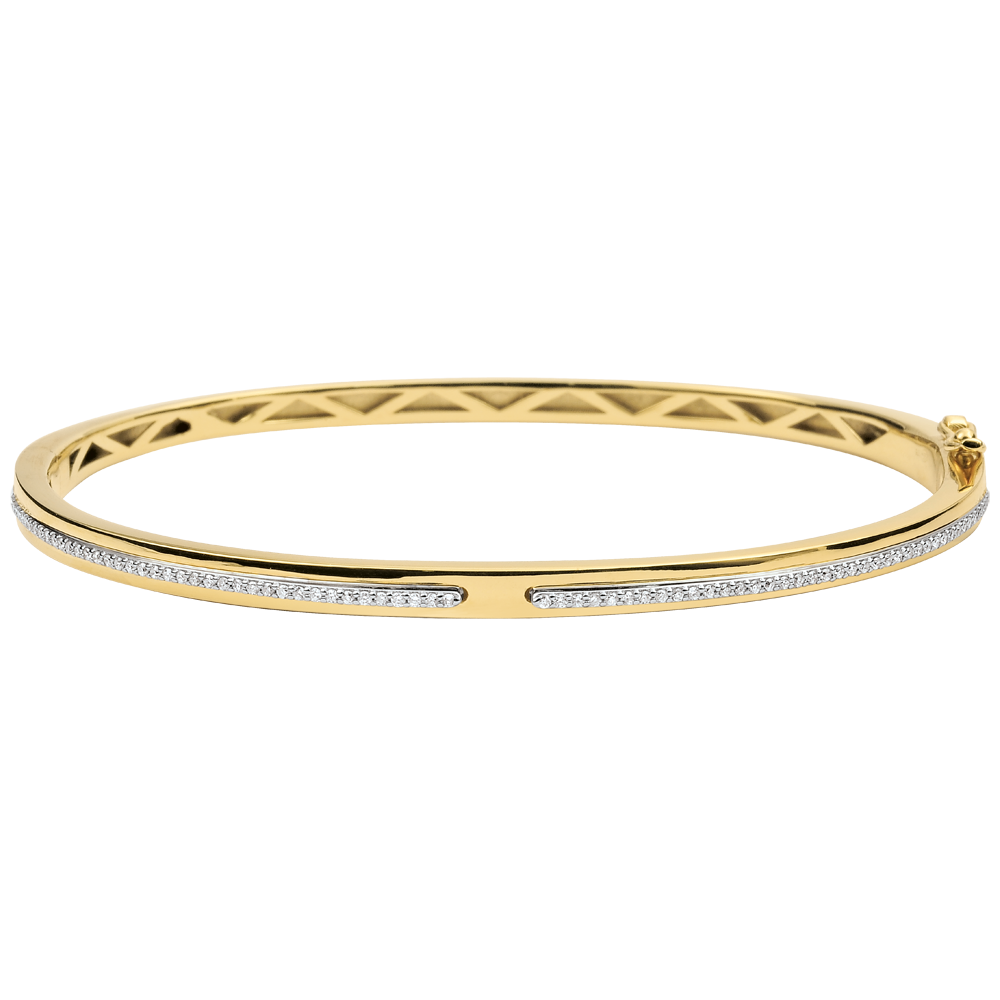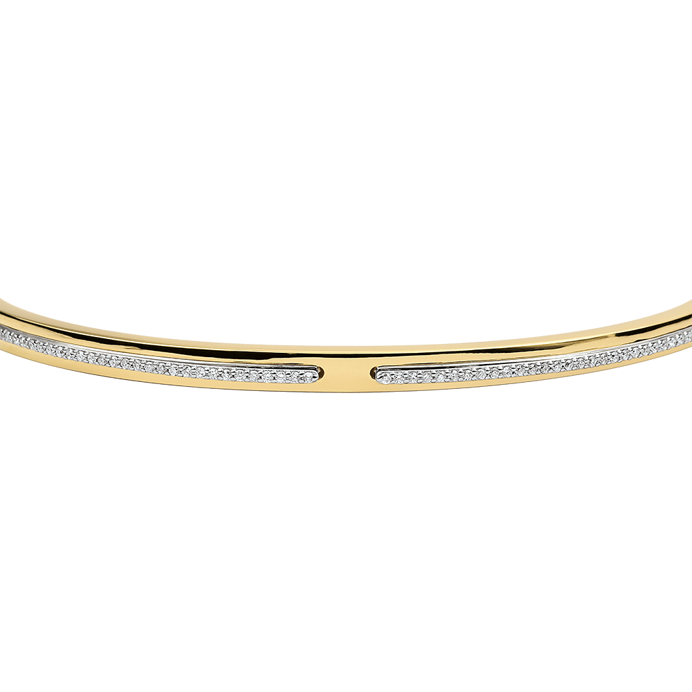 Due file di diamanti sono unite come una promessa d'eternità racchiusa in un bracciale rigido in oro giallo.