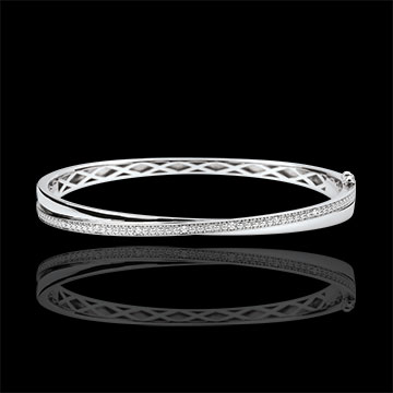 Bracciale rigido composto da un anello in oro bianco finemente intrecciato a un anello interamente ricoperto di diamanti.
