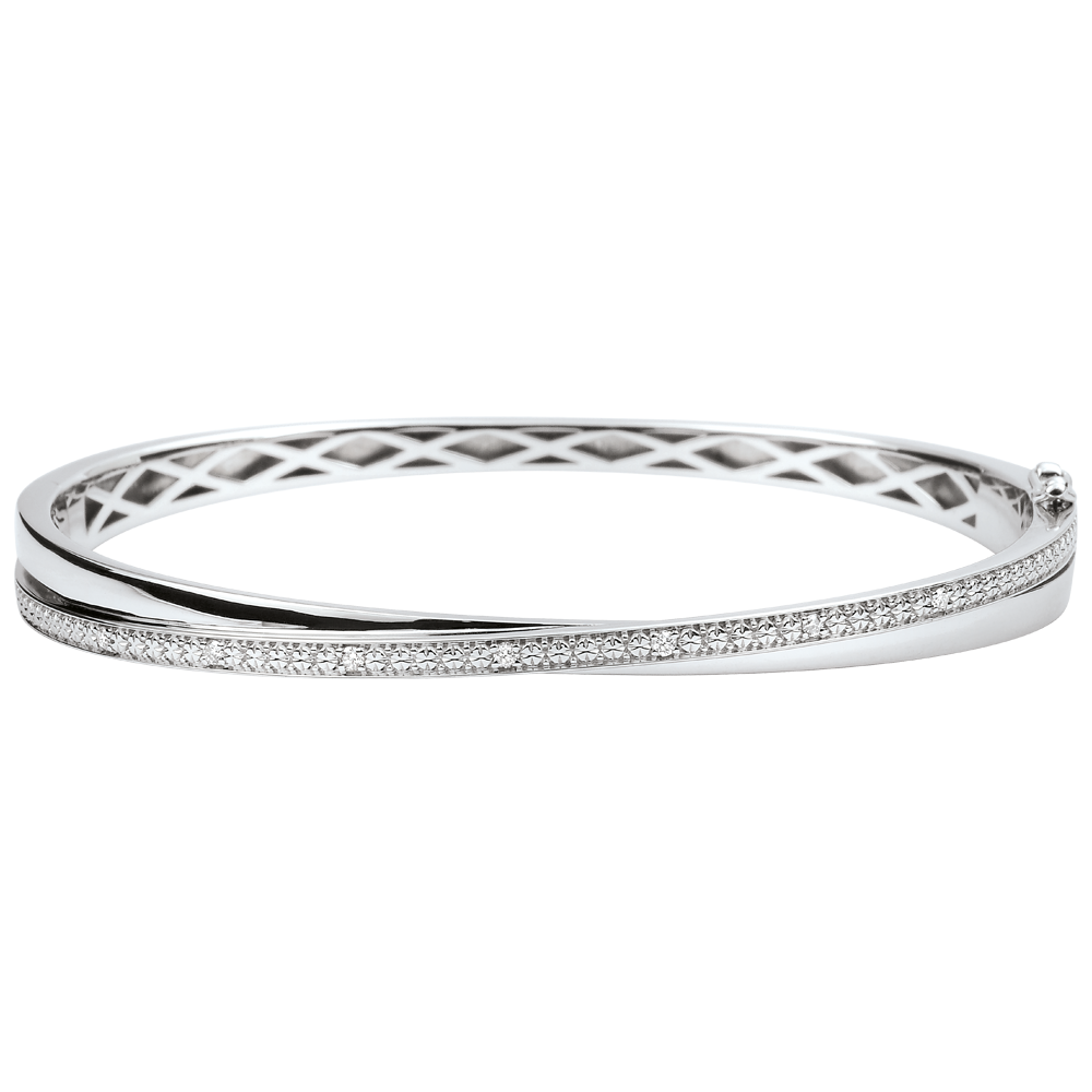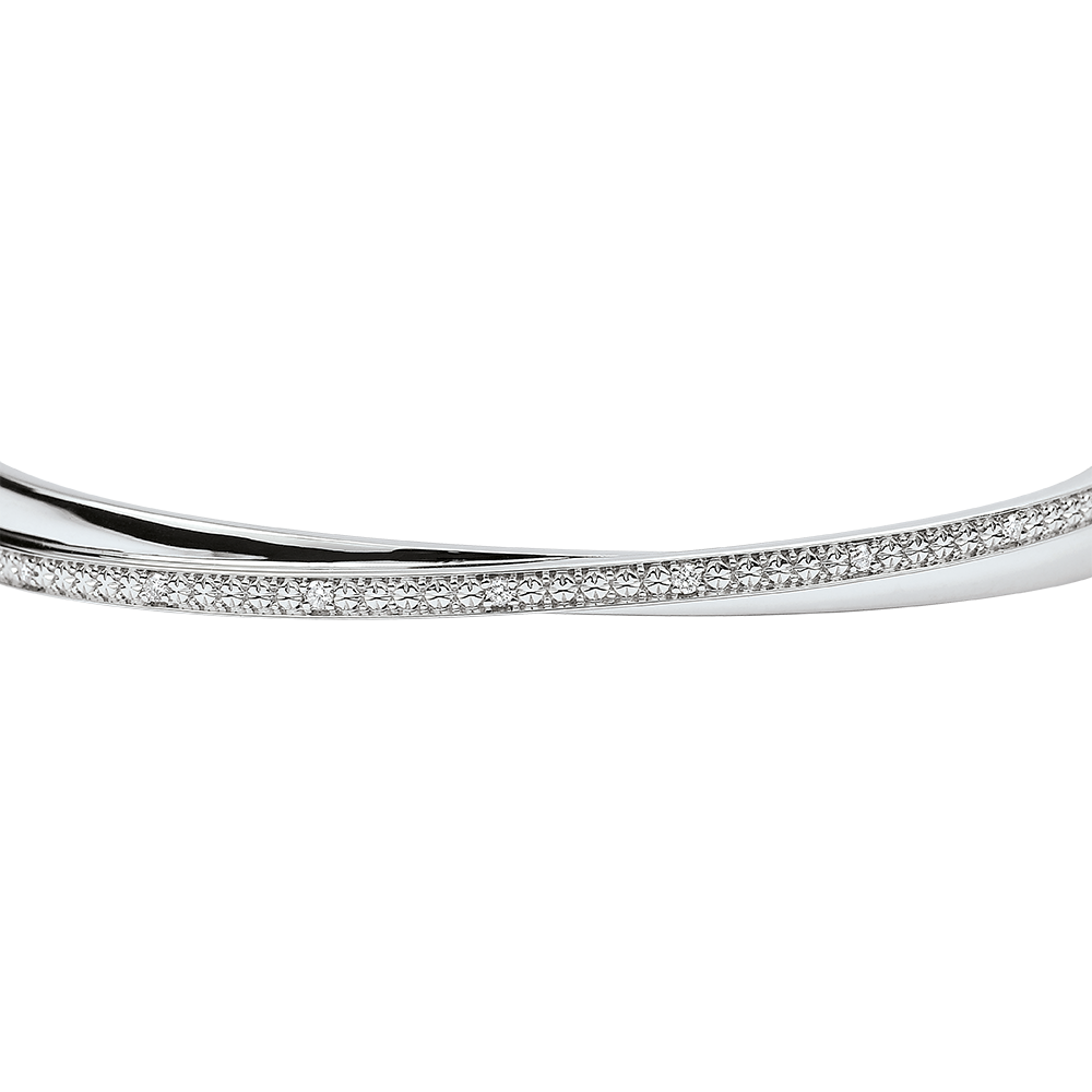Bracciale rigido composto da un anello in oro bianco finemente intrecciato a un anello interamente ricoperto di diamanti.