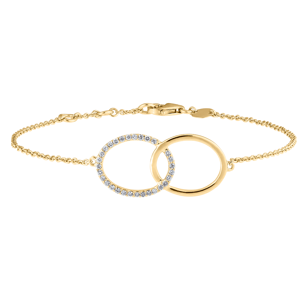 Come dei nastri, i cerchi d'oro giallo s'intrecciano dolcemente. Un cerchio in oro e un cerchio in oro e diamanti.