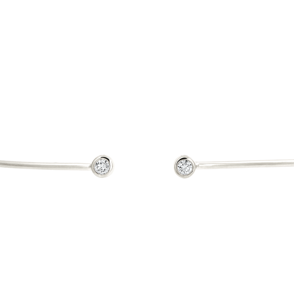 Un braccialetto rigido sottile ed elegante, impreziosito da due delicati diamanti . Da indossare solo o abbinato alla versione in oro giallo e in oro rosa.