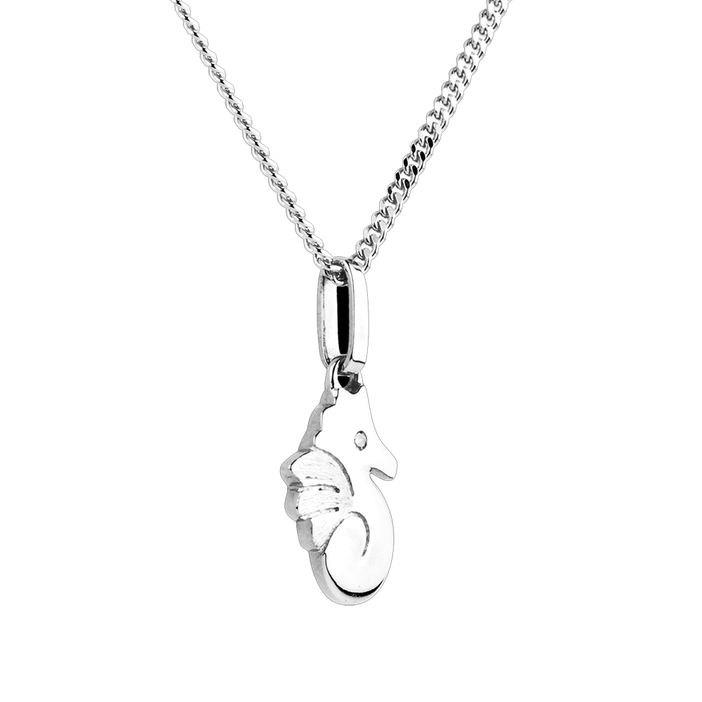 Un piccolo ippocampo in Oro bianco dalla forma tondeggiante e un occhio di diamante. Modello grande.