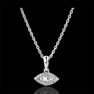 Una trilogia di diamanti baguette, esaltata da un pavé a mandorla, per un ciondolo dalle forme ispirate alle favole orientali.