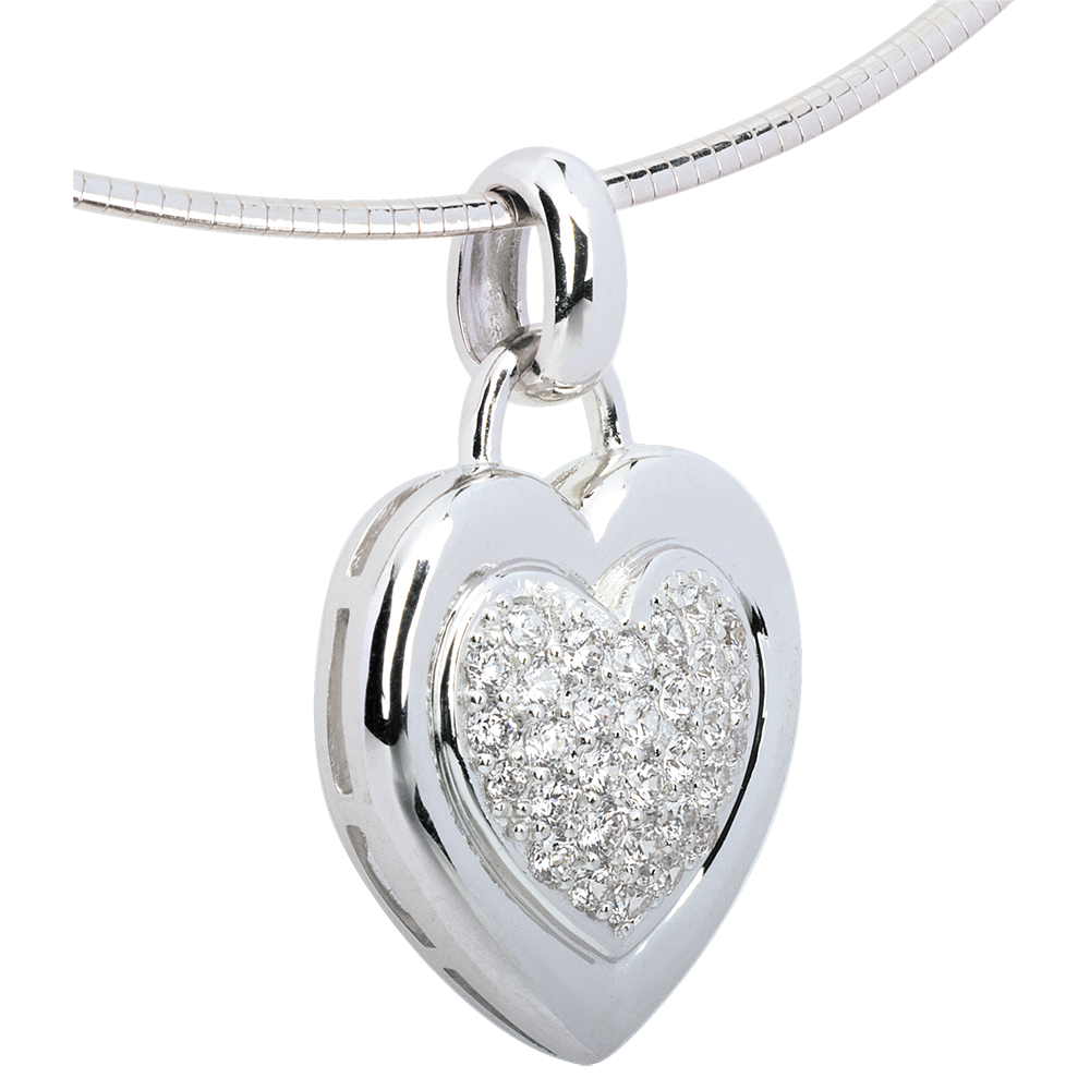 Un simbolo eterno di passione, per un ciondolo in Oro bianco con pavé di diamanti luminoso e femminile.