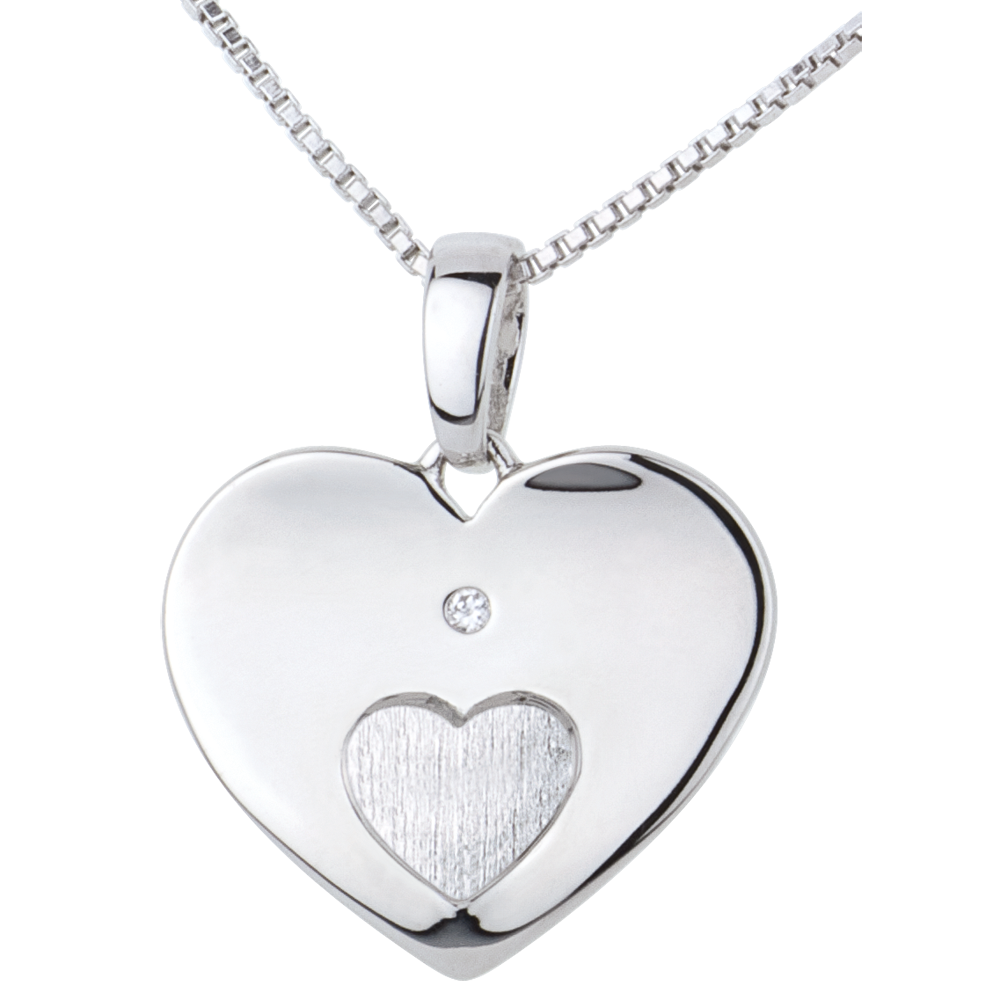 Un cuore dalle linee sinuose è impreziosito da un diamante e porta al centro un piccolo cuore bombato in Oro spazzolato.