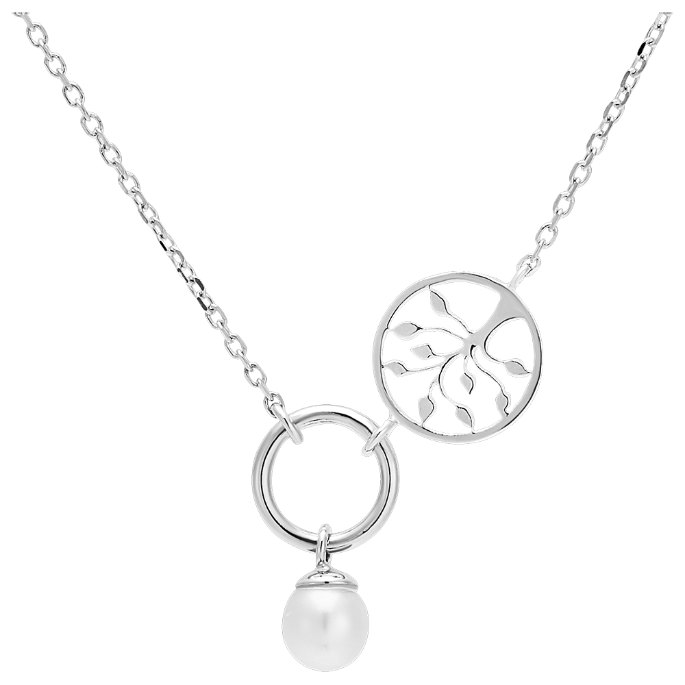Una collana in oro bianco impreziosita da un anello, una perla e un ciondolo albero della vita, per un modello che incarna il movimento e la leggerezza.