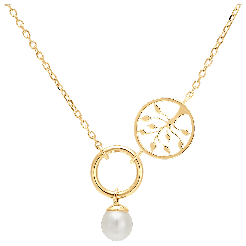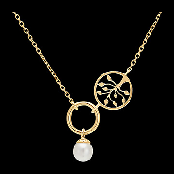 Una collana in oro giallo con anello, perla e ciondolo albero della vita, per un modello che simboleggia il movimento e la leggerezza.