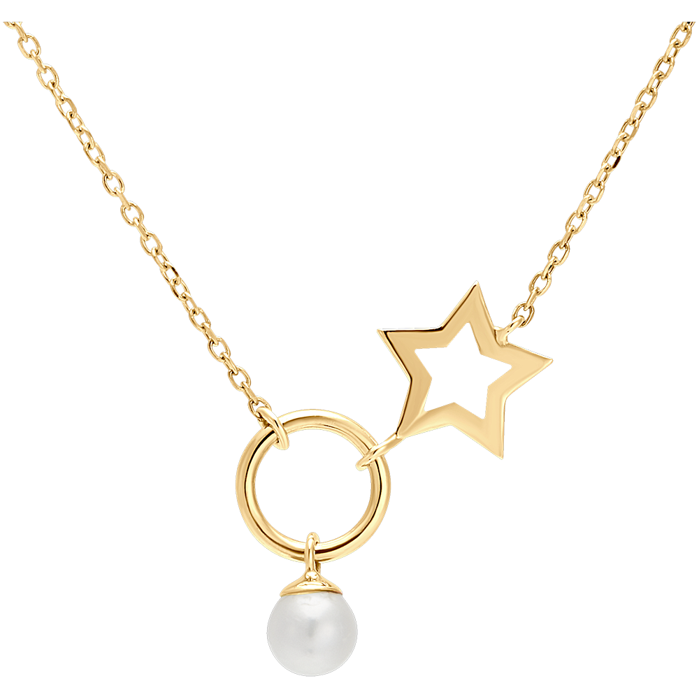 Una collana in oro giallo impreziosita da un anello, una perla e un ciondolo a stella, per un modello pieno di movimento e leggerezza.