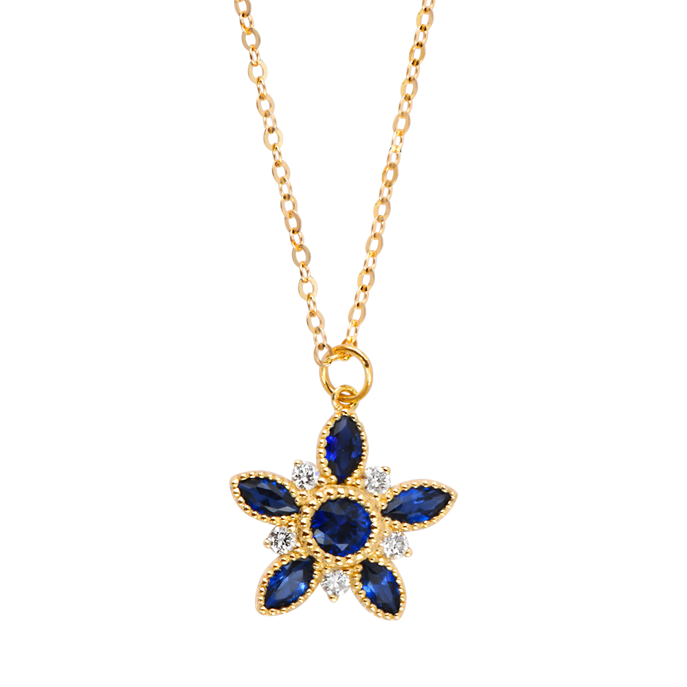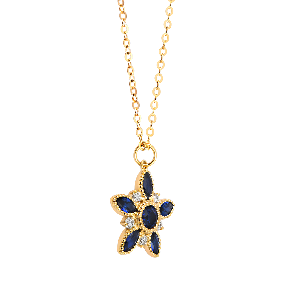 Sei zaffiri intensi disegnano una stella floreale, impreziositi da cinque diamanti scintillanti.Una collana dallo stile celestiale, tra mistero notturno e splendore regale.