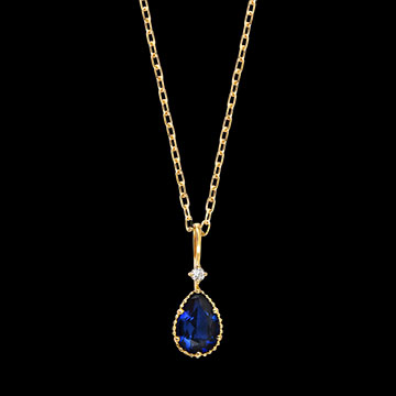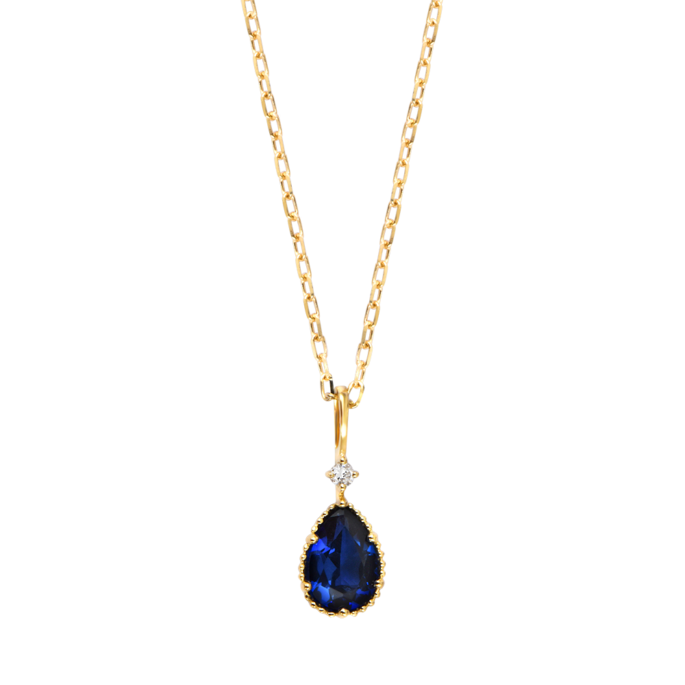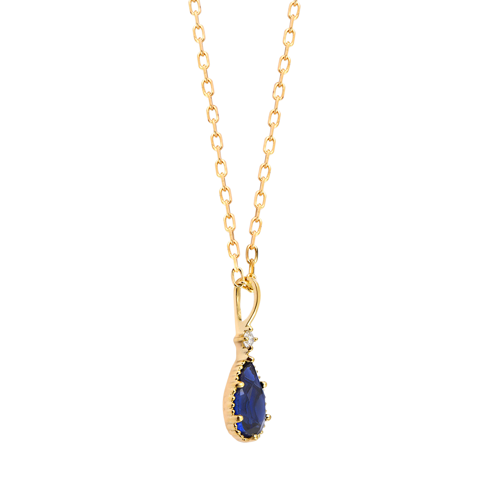 La collana presenta uno zaffiro sintetico blu da 0,5 carati a goccia sfaccettata e un diamante sintetico, per una brillantezza raffinata e duratura.