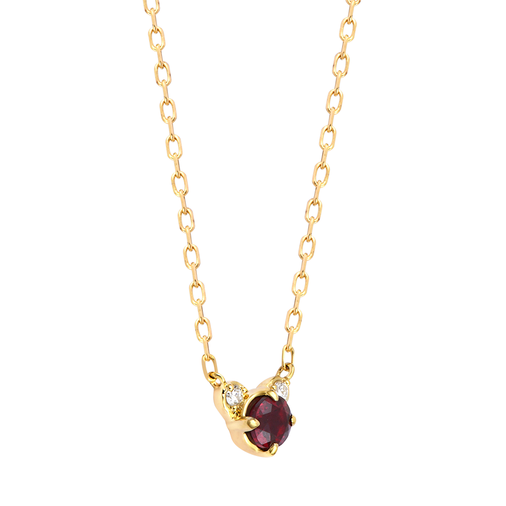 La collana è impreziosita da un rubino sintetico di qualità Very Good e due diamanti sintetici di qualità HSI, per un totale di 0,17 carati.